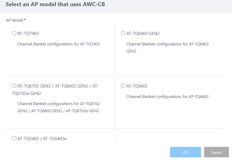 NoteThis option is displayed with selecting "AT-TQ6702 GEN2 / AT-TQ6602 GEN2 / AT-TQ6702e GEN2" for AP model in the "Select an AP model that uses AWC-CB" dialog box. |