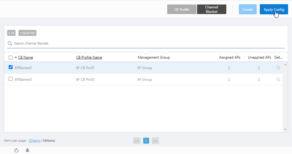 Checkbox Lets you select channel blankets. A checkbox in the header row can be used to check or uncheck all channel blankets. Unchecking the box in the heading row deselects all entries in the list. CB Name Shows the name of the channel blanket. CB Profile Name Shows the CB Profile name on which the channel blanket is based. Management Group Shows the list of management groups for the CB Profile. Assigned APs Shows the number of APs to which the CB Profile is assigned. Unapplied APs Shows the number of APs for which pending configuration (AP Profile, CB Profile, SC Profile, or AP-specific configuration) exists. Detail (magnifying glass icon) Shows the "CB Profile Details" page. Refer to the Operation Reference > Channel Blanket > Create Channel Blanket" > "View Channel Blanket Information section for more details on the "CB Profile Details" page. - Select the CB Profiles to whose member APs you want to apply the pending configuration.