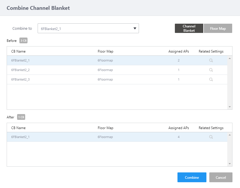 In addition, by selecting "Floor Map" from the "Combine Channel Blankets" dialog's upper right display format button, you can see a color-coded image of the channel blankets to which the APs belong after the combination.