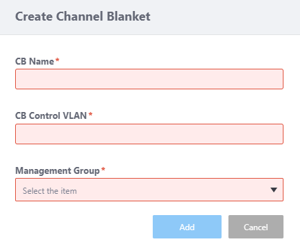 Table 1: "Create New Channel Blanket" dialog box Item Name Description CB Name Enter a name for the channel blanket. Should be 1 to 100 characters in length, with alphabets, numbers and symbols (including spaces). (required) CB Control VLAN Specify the Control VLAN ID (between 1 and 4094) to use for the channel blanket (required)