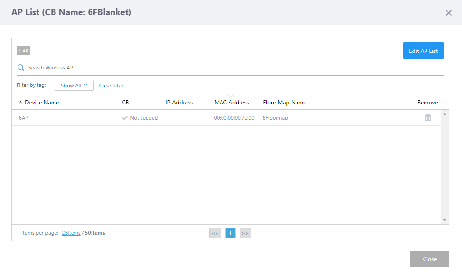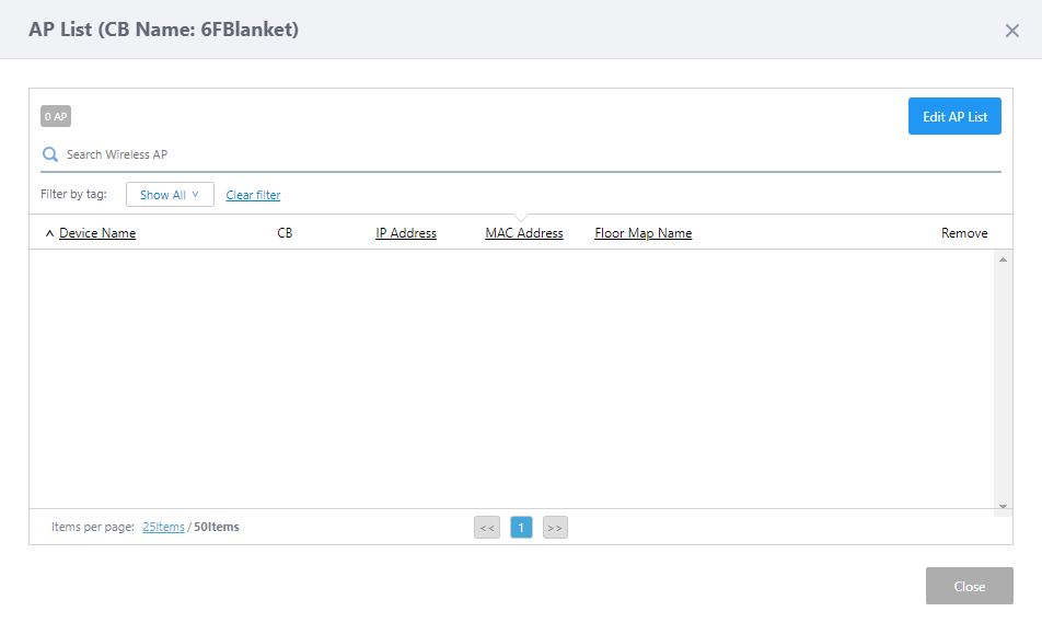 IP Address Shows the AP's IP address. MAC Address Shows the device's MAC address. Floor Map Name Shows a floor map name where the AP is placed. Remove (Trashbin icon) Lets you remove the AP from the channel blanket. "Close" button Closes the "AP List" dialog box and goes back to the "Edit CB Profile" page. - Click the "Edit Member AP" button at the top right of the dialog box.