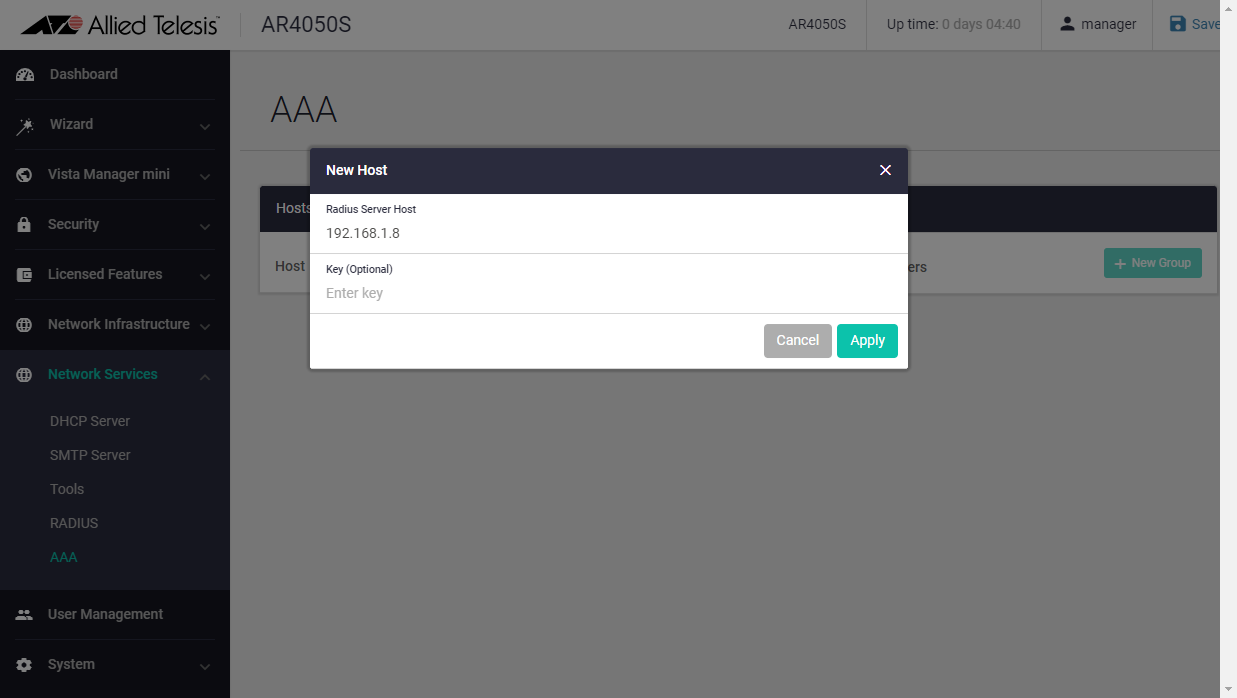 In the web GUI of the AlliedWare Plus device, open the "Network Services" -> "RADIUS Client" page, click the "Add Server" button, and enter Vista Manager mini's own IP address as a fake setting in the IP address field. The shared password can be random because it will not be referenced again.