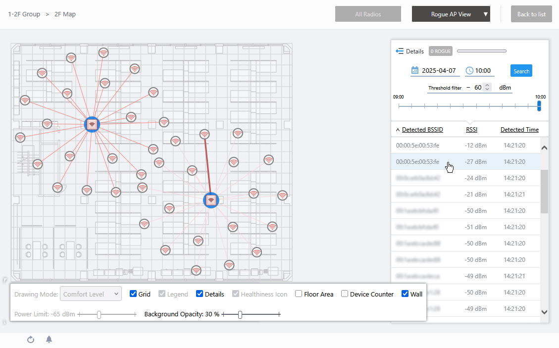 The Rogue AP list on the right side of the screen shows the BSSID, RSSI and detection time of rogue APs. You can view and filter rogue APs by a time period, or by their signal strength received on the managed APs, by using the various controls at the top of the list.