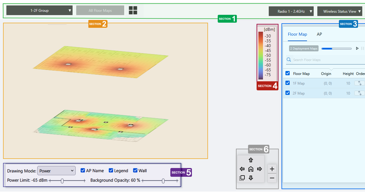 Each floor map displays the icons of the APs placed in the individual floor map detail screen, a heat map showing the channel or signal reach and strength in color around the wireless APs, and the areas or walls you have created.