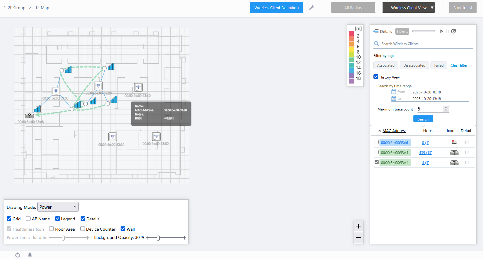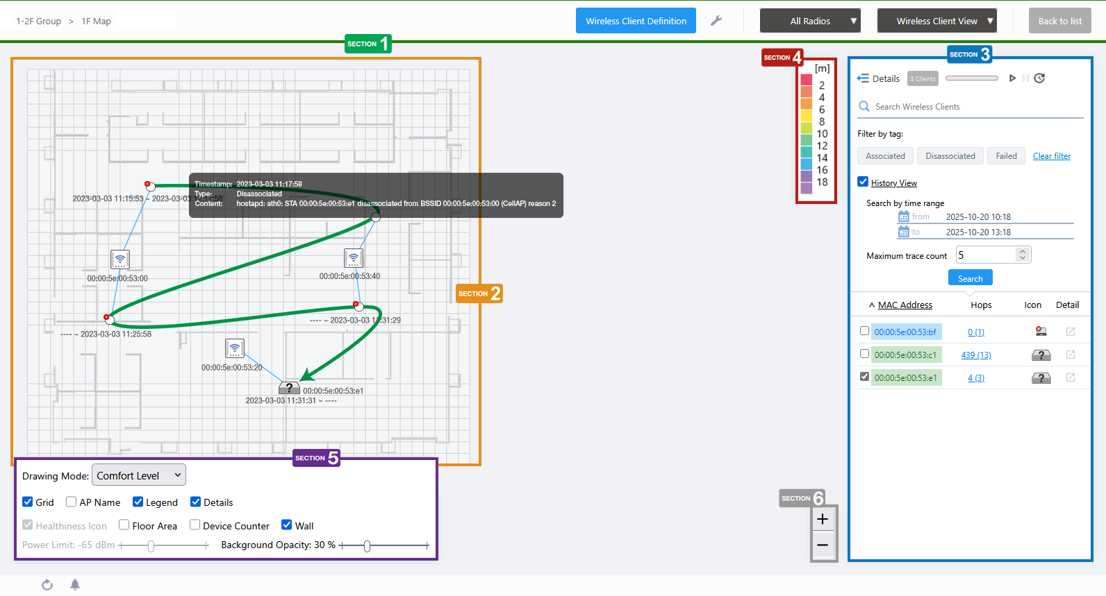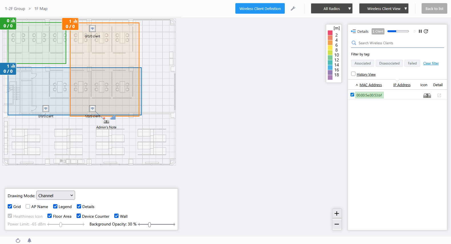 For more information on the heatmap view format for each drawing mode, see "Floor map details [radio status view]".