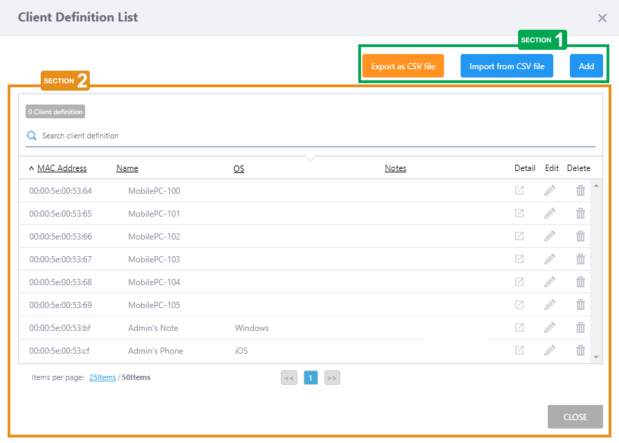 | Search client definition | Lets you search client definition entries. The Search field lets you enter a partial string to match. The screen displays entries with that string in one of the following fields: "MAC Address", "Name", "OS", or "Notes". To remove the filter, delete the string from the Search field and press Enter. NoteThe search is case-sensitive. |