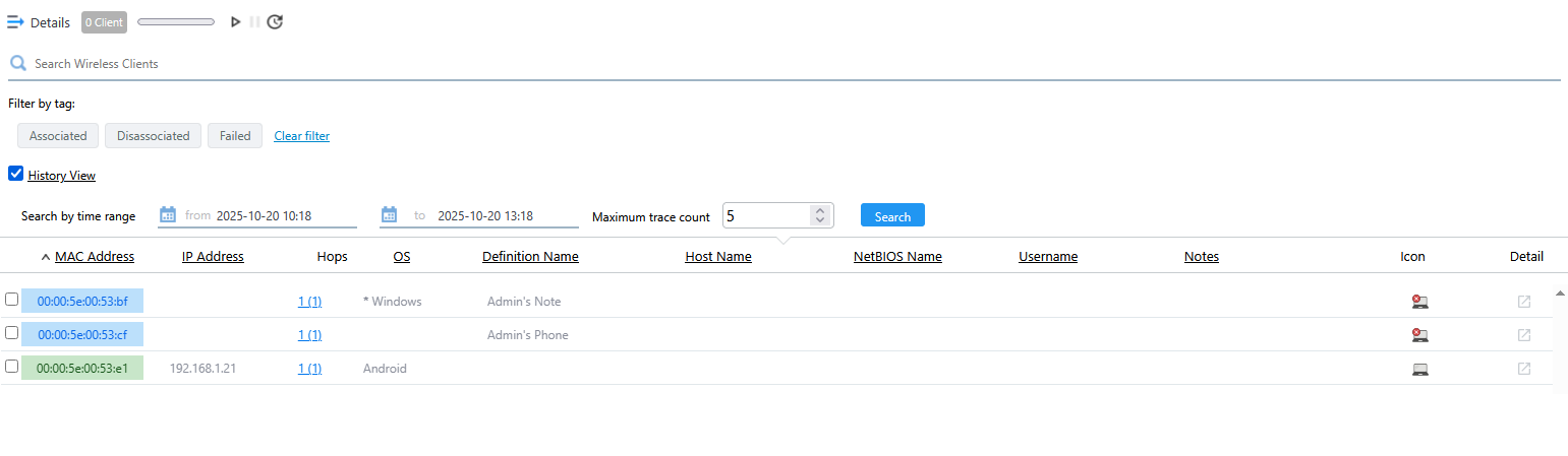 | Details | You can click here to see client details such as Hostname, Username (based on WPA Enterprise), Duration, Client Name, Notes, SSID, Associating AP, and RSSI, in addition to the items displayed by default (MAC and IP addresses). Clicking Details again returns you to the default non-detailed view. |