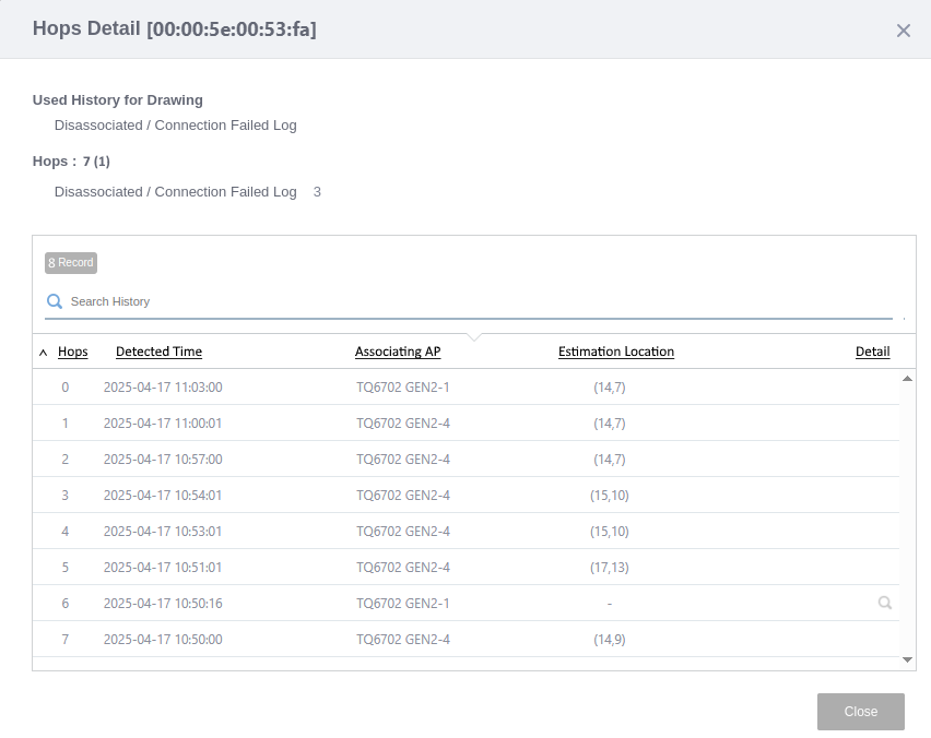 | Client detection history list | Displays the MAC addresses and the detected times of the clients estimated to be in the area within the period by the Client Location Estimation feature. Client detection is performed periodically, and when the same MAC address is detected more than once, a detection is recorded each time.