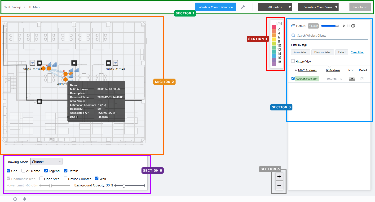 If you select "Wireless Client View" from the dropdown menu on Floor Map Details, the screen switches to the Wireless Client View screen.