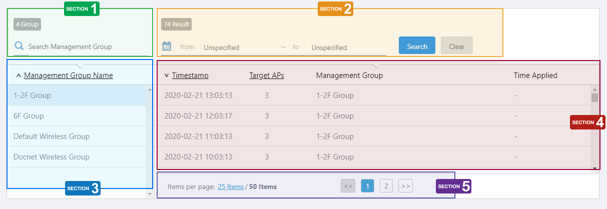 | Search Management Group | Lets you filter the list of management groups. The Search field lets you enter a partial string to match. The screen displays entries with that string in their name. To remove the filter, delete the string from the Search field and press Enter. NoteThe search is case-sensitive. |