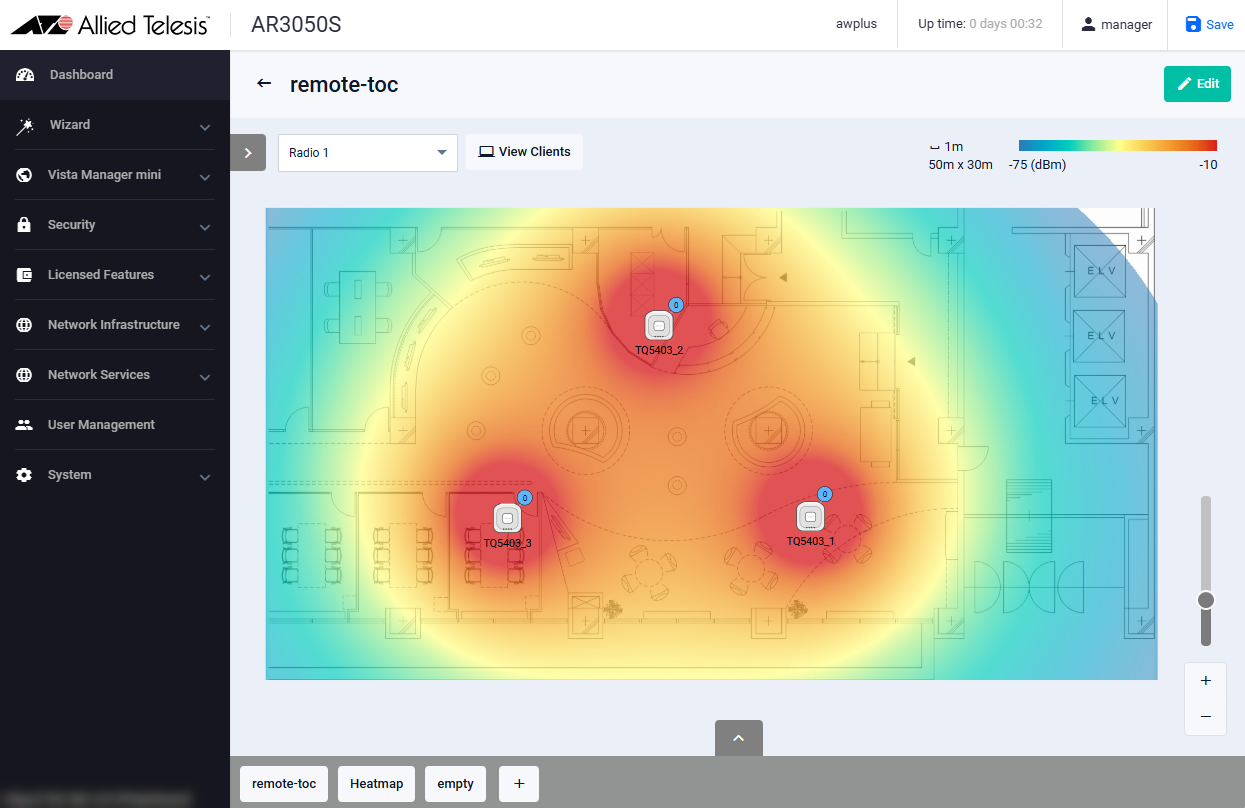 NoteThe heatmap calculates the radio signal strength at a given point from an AP's transmit power and the distance between the AP and the point. Because it assumes that there are no obstacles and reflection between the AP and the point, the actual radio signal strength may differ from the heatmap's calculation.