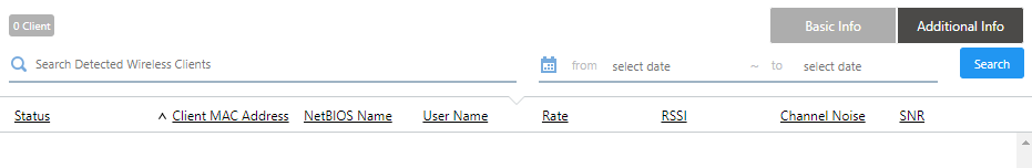| Search Detected Wireless Client | Lets you filter the list of detected wireless clients. The Search field lets you enter a partial string to match. The screen displays entries with that string in one of the following fields: "Status", "Client MAC Address", "SSID", "BSSID", "NetBIOS Name" or "User Name"; or the client IP address. To remove the filter, delete the string from the Search field and press Enter. NoteThe search is case-sensitive. |