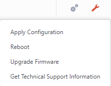 Hovering the mouse cursor over the Spanner icon shows a dropdown menu including "Apply Configuration", "Reboot", "Update Firmware", and "Get Technical Support Information". These menu items can be selected only when you have selected at least one AP in the list.NoteThe maximum number of APs you can reboot in a single operation is 350. NoteThe number of APs that can be updated at a time depends on the traffic rate between the AWC Plug-in and each AP.