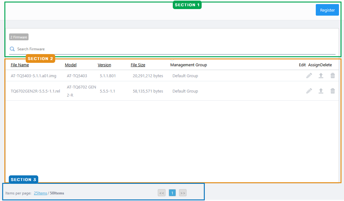 | "Register" button | Add a firmware file to the AWC Plug-in's firmware database. Refer to Operation Reference > Miscellaneous Settings > Reboot AP and Update AP Firmware"'s "Add Firmware for more details. |