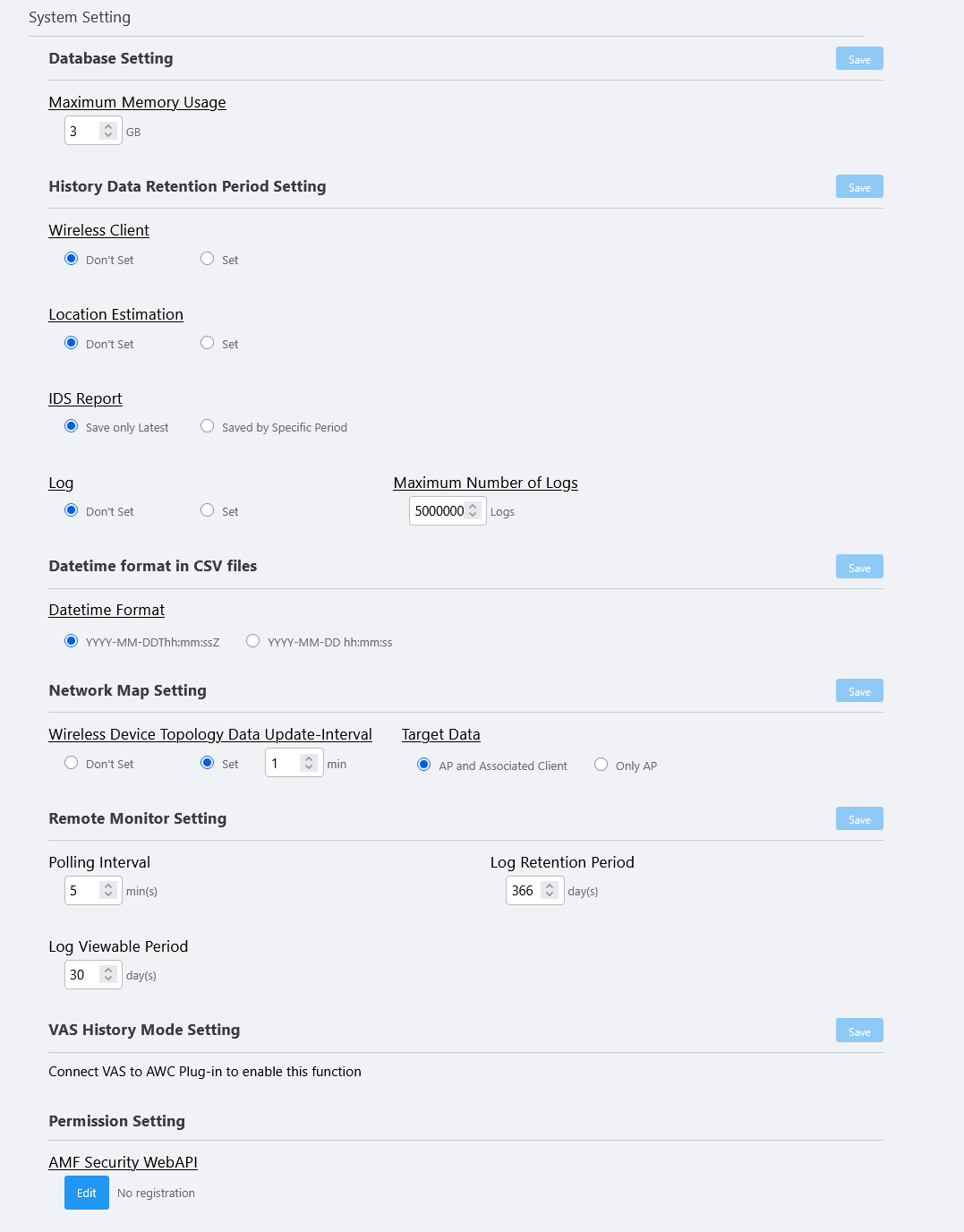 | Associated Client History | If VAS is configured, set the duration of the history of wireless client association and location information to be recorded in VAS.