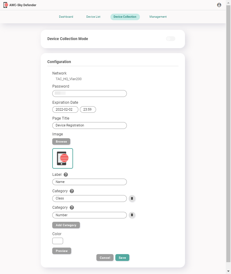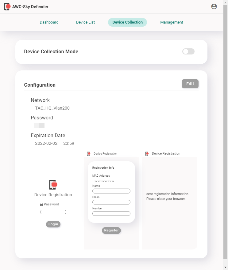 When the Device Collection mode is enabled, wireless clients connected via the SSID of the Collection Network displayed in the "Network" field of the Configuration section will be connected to the captive portal for device collection (Device Collection page).