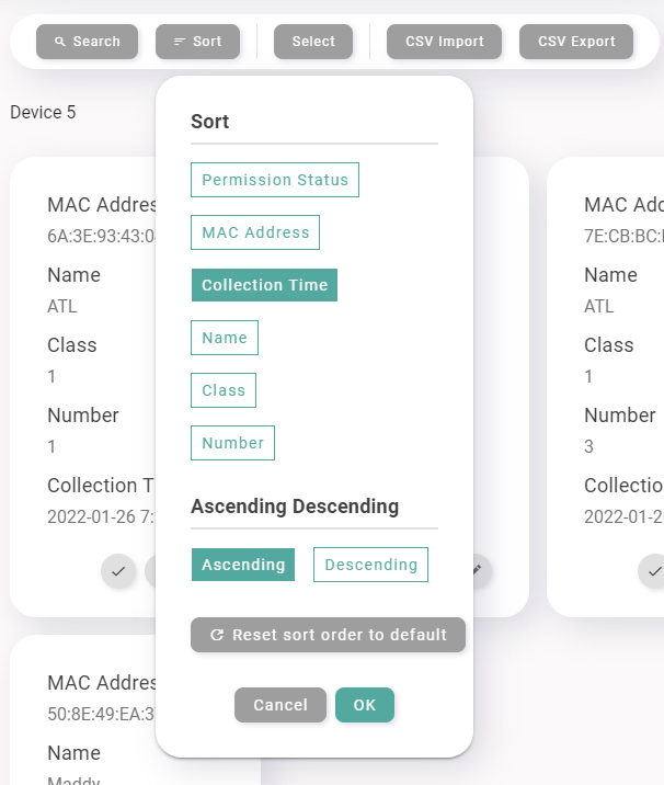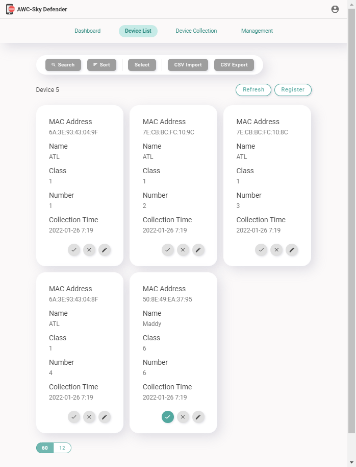 | Device panels | Displays the MAC address of the registered device, as well as the information entered with the MAC address, and the date and time of collection. Also, when you click on a panel, a green outline will appear on the panel and it will become selected. In selected state, it will be subject to batch Allow/Deny setting from the "Select" button at the top of the list. Click on the panel again to remove the outline and deselect it.