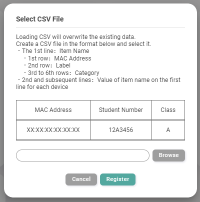 | "Select File" button | Displays the system's file selection dialog. The format of the CSV file that can be read is as follows: