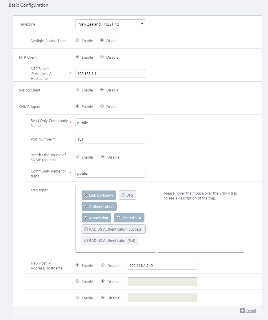 - Clicking "+ Detail" will show the "NTP Synchronization Interval", "MAC Address List", "LED" and "Factory Reset Button" fields.