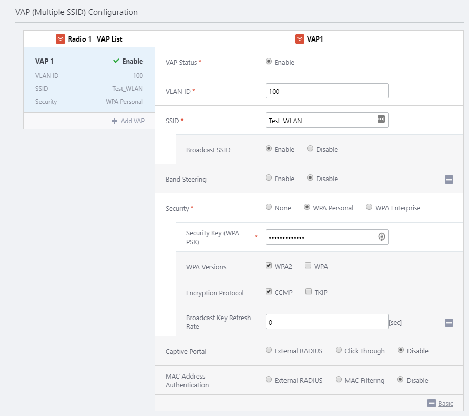 SSID Test_WLAN Test_WLAN Specify an SSID (network name) to use on the VAP. Broadcast SSID Enable Enable Specify whether to broadcast the SSID on the VAP. Band Steering Disable - Specify whether to use the Band Steering feature, which encourages clients supporting both 2.4GHz and 5GHz to prefer 5GHz, to reduce congestion in the 2.4GHz band.