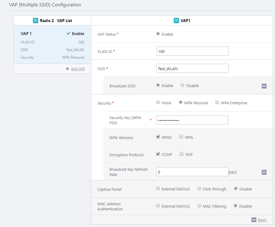 This item is not supported, and therefore is not displayed, when the Profile Type is "Single" (TQ3200).Security WPA Personal WPA Personal Specify a security method for the VAP. Security Key (WPA-PSK) 4YourEyesOnly 4YourEyesOnly Specify an encryption key for the VAP. WPA Versions WPA2 WPA2 Specify a WPA version to use on the VAP. Encryption Protocol CCMP CCMP Specify an encryption protocol to use on the VAP. Broadcast Key Refresh Rate 0 0 Specify an interval at which to refresh the broadcast key that is sent to clients on the VAP. Specifying "0" stops the key from refreshing. Captive Portal Disable Disable Specify whether to use the Captive Portal feature on the VAP. MAC Address Authentication Disable Disable Specify whether to use MAC Address Authentication on the VAP.