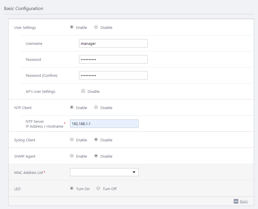 - You can specify the AP's system settings in the "Basic Configuration" section.