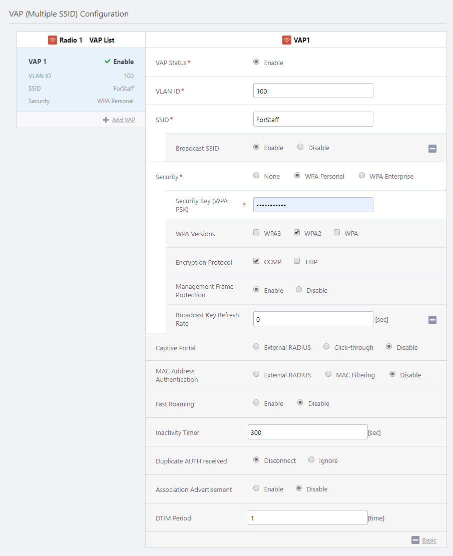 Item Name Value Description Radio 1 VAP 1 VAP Status Enable Enables or disables the VAP. VLAN ID 100 Specify a VLAN ID (between 1 and 4094) to use on the VAP (mandatory). SSID ForStaff Specify an SSID (network name) to use on the VAP. Broadcast SSID Enable Specify whether to broadcast the SSID on the VAP. Security WPA Personal Specify a security method for the VAP. Security Key (WPA-PSK) 5+@f/=0N1y Specify an encryption key for the VAP. WPA Versions WPA2 Specify a WPA version to use on the VAP. Encryption Protocol CCMP Specify an encryption protocol to use on the VAP. Management Frame Protection Enable Specify whether to protect Management Frames. Broadcast Key Refresh Rate 0 Specify an interval at which to refresh the broadcast key that is sent to clients on the VAP. Specifying "0" stops the key from refreshing. Captive Portal Disable Specify whether to use the Captive Portal feature on the VAP. MAC Address Authentication Disable Specify whether to use MAC Address Authentication on the VAP. Fast Roaming Disable Specify whether to use Fast Roaming of wireless clients. Inactivity Timer 300 Specify the delay before disconnecting a client that disappears without notifying the APs. Duplicate AUTH received Disconnect Select how to process connection requests from clients that have maintained a connection. Association Advertisement Disable Specify whether to use Association Advertisement. DTIM Period 1 Specify how frequently to insert a DTIM (Delivery Traffic Indication Map) in the AP's beacons.
