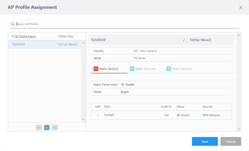 - Make sure that the AP Profile "TQ5403AP" created in Create AP Profile is selected in the AP Profile list, Click "Save".