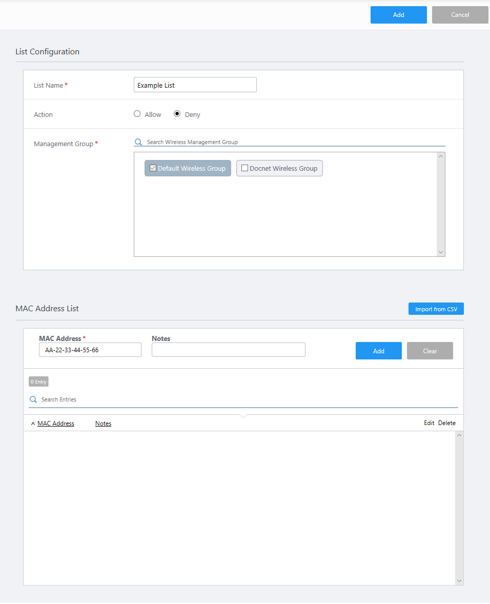 - "Add" button: Import MAC addresses from the specified CSV file.