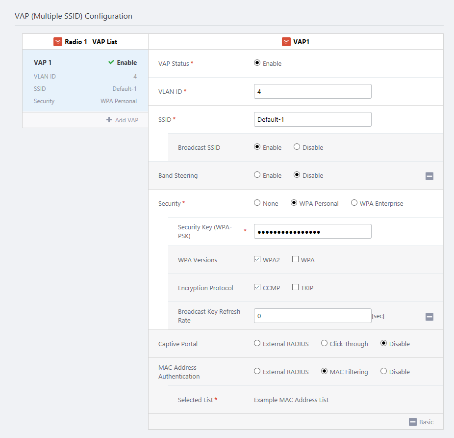 - In the "VAP (Multiple SSID) Configuration" section, select "MAC Filtering" for each VAP on which you want to use MAC Address Authentication using the list.