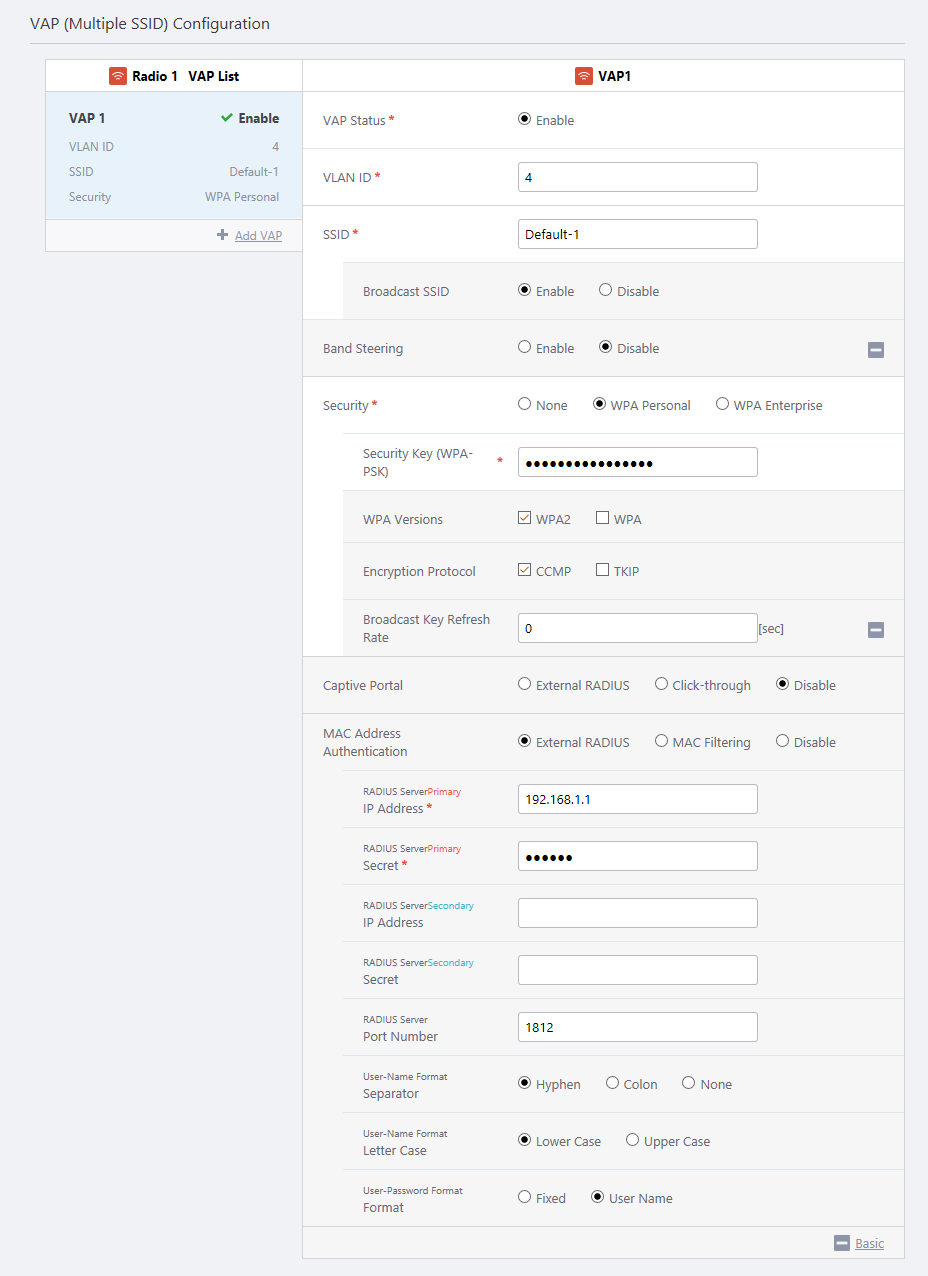 To use an external RADIUS server for MAC Address Authentication, you have to create an AP Profile. Refer to Configure AP Profiles for details.In the "VAP (Multiple SSID) Configuration" section, select "External RADIUS" for each VAP on which you want to use MAC Address Authentication using RADIUS servers.
