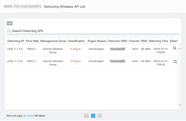 You can filter entries in the list by entering a partial string in the search box. The Search field lets you enter a partial string to match. The screen displays entries with that string in one of the following fields: "Detected BSSID" or "Detecting AP". To remove the filter, delete the string from the Search field and press Enter. NoteThe search is case-sensitive. |