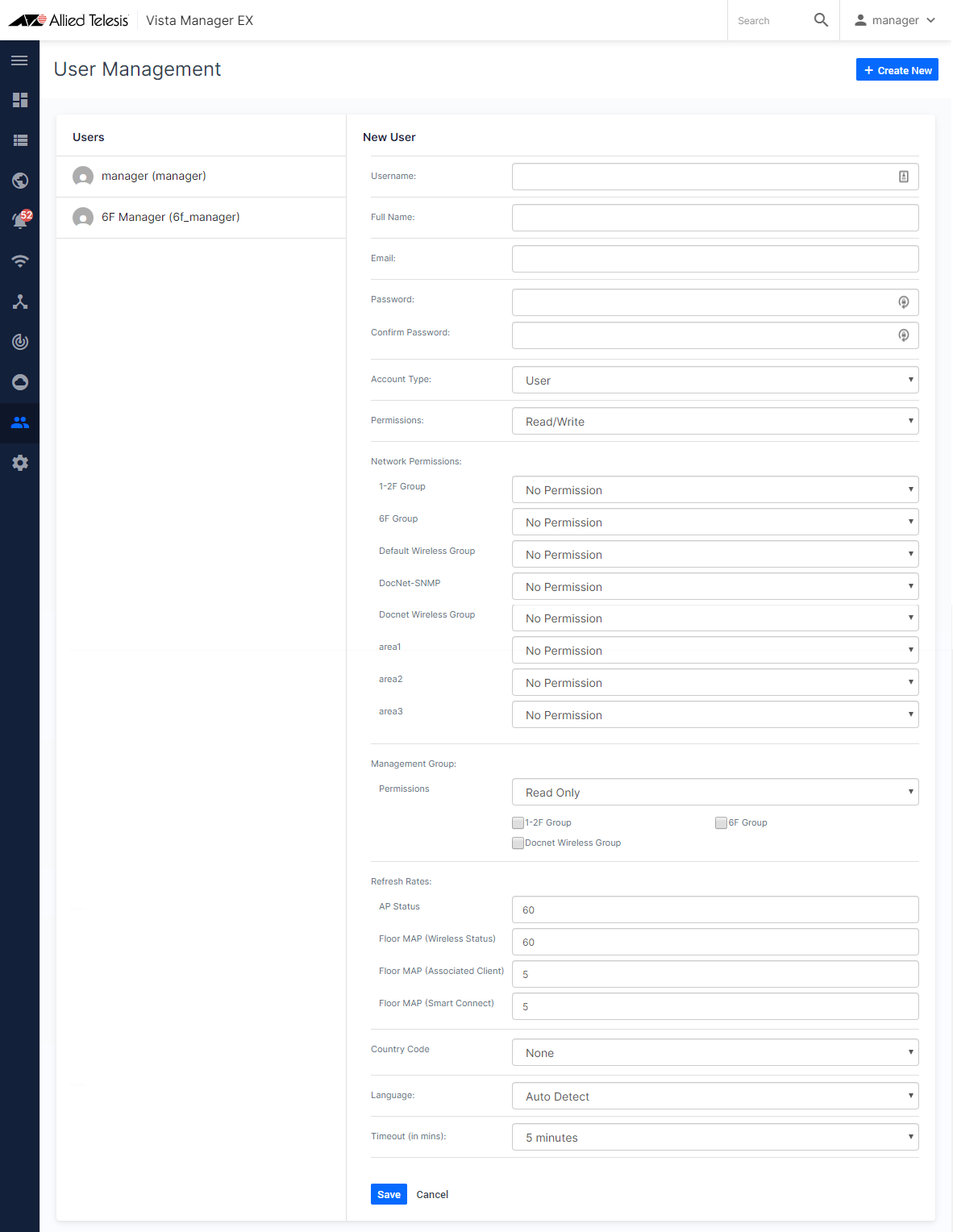 - If you specify "User" for the Account Type, select the user's permissions for Vista Manager EX Service Monitoring and the user's network access permissions for various "areas" (AMF areas, the AWC Plug-in's Management Group and the SNMP Plug-in's Subnet).