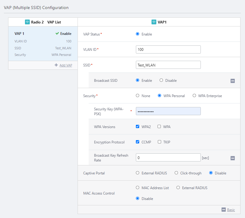 This item is not supported, and therefore is not displayed, when the Profile Type is "Single" (TQ3200).Security WPA Personal WPA Personal Specify a security method for the VAP. Security Key (WPA-PSK) 4YourEyesOnly 4YourEyesOnly Specify an encryption key for the VAP. WPA Versions WPA2 WPA2 Specify a WPA version to use on the VAP. Encryption Protocol CCMP CCMP Specify an encryption protocol to use on the VAP. Broadcast Key Refresh Rate 0 0 Specify an interval at which to refresh the broadcast key that is sent to clients on the VAP. Specifying "0" stops the key from refreshing. Captive Portal Disable Disable Specify whether to use the Captive Portal feature on the VAP. MAC Access Control Disable Disable Specify whether to use MAC Access Control on the VAP.