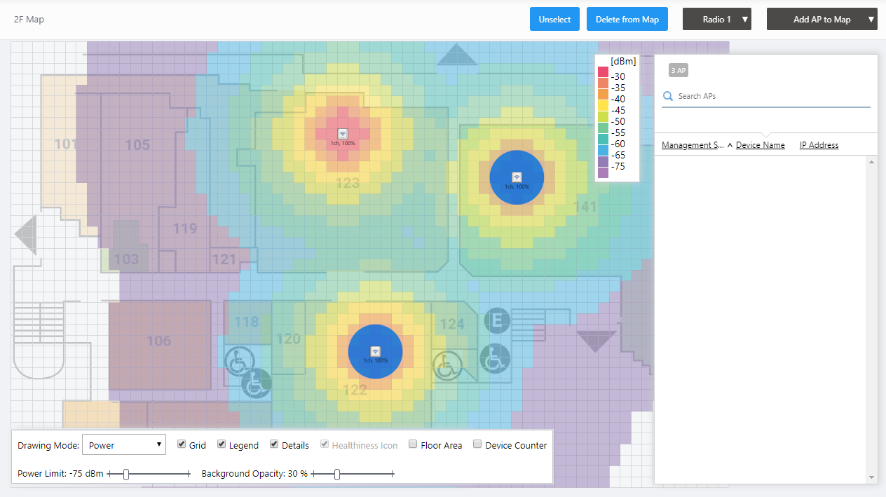 Once the AP is placed on the map, the AWC Plug-in calculates radio wave propagation from the AP's transmit power, and shows it on the map according to the map's scale (Heatmap function).