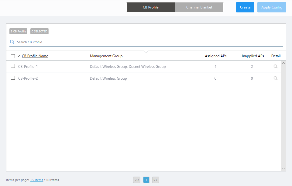 Checkbox Lets you select channel blankets. A checkbox in the header row can be used to check or uncheck all channel blankets. Unchecking the box in the heading row deselects all entries in the list. Channel Blanket Name Shows the name of the channel blanket. CB Profile Name Shows the CB Profile name on which the channel blanket is based. Management Group Shows the list of Management Groups for the CB Profile. Assigned APs Shows the number of APs to which the CB Profile is assigned. Unapplied APs Shows the number of APs for which pending configuration (AP Profile, CB Profile, SC Profile, or AP-specific configuration) exists. Detail (magnifying glass icon) Shows the "CB Profile Details" page. Refer to the Operation Reference > Channel Blanket > Create Channel Blanket's View Channel Blanket Information section for more details on the "CB Profile Details" page.
