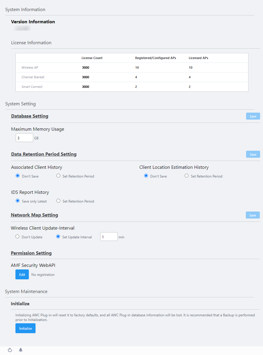 The System Setting page lets you see the AWC Plug-in version, factory-reset the plug-in, and configure system settings.
