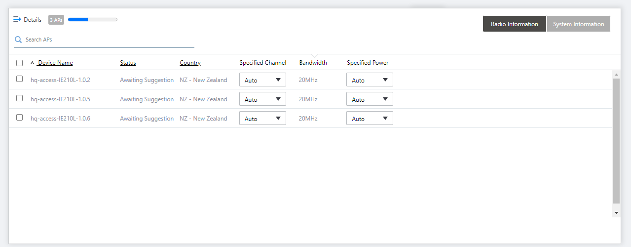 Click "Details" at the top of the AP list to expand the list and display information such as models, AP profiles, etc.The list can be switched between radio information and system information of the wireless APs. In the initial state, wireless information of the wireless APs is displayed.
