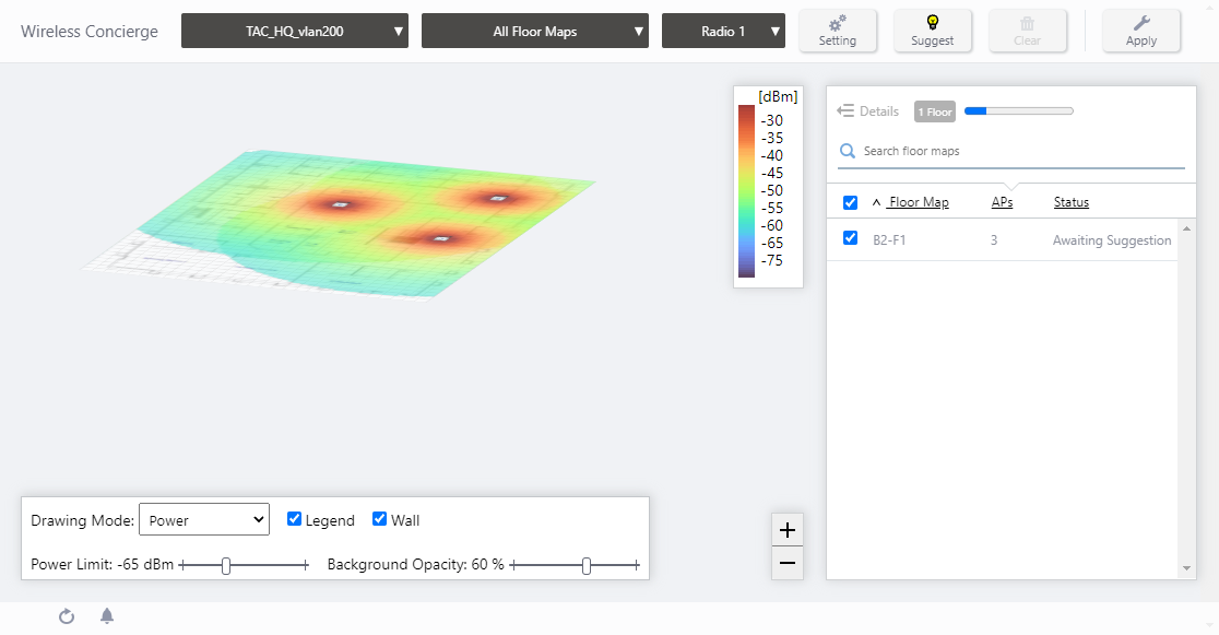 There are two optimization suggestions. For each selected floor map or wireless APs, you can request and apply one or both suggestions.