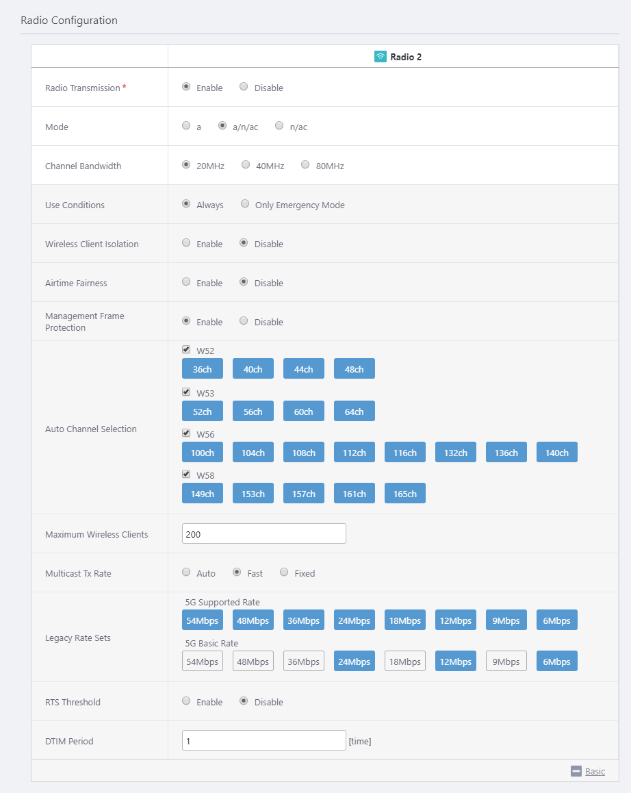 Refer to Enable Emergency Mode for more details.Wireless Client Isolation Disable Disable Specify whether to block communication between wireless clients connected to the same VAP. Airtime Fairness Disable Disable Specify whether to give each client an equal amount of airtime regardless of its speed. Management Frame Protection Enable Enable Specify whether to protect management frames from eavesdropping and forging. Auto Channel Selection All All Specify the channels to use. All channels are selected by default. Maximum Wireless Clients 200 200 Specify the maximum number of clients that can connect to the APs. Multicast Tx Rate Fast Fast Specify a selection method for IEEE 802.3 multicast/broadcast transmission rate. Legacy Rate Sets
