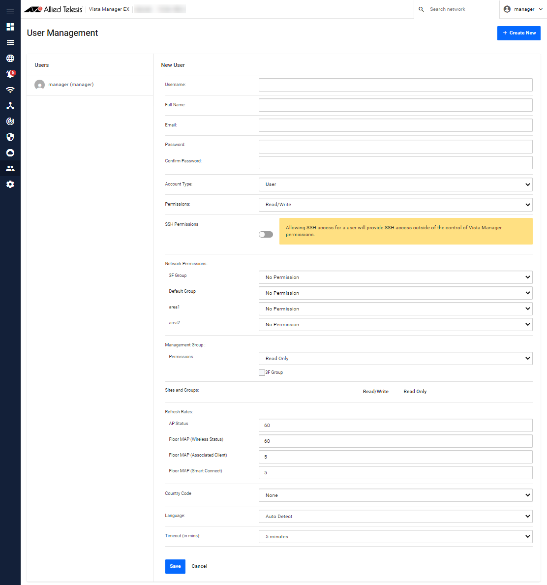 If the Account Type is "User", the option for the permission of SSH connection to the AMF devices in authorized areas is displayed.