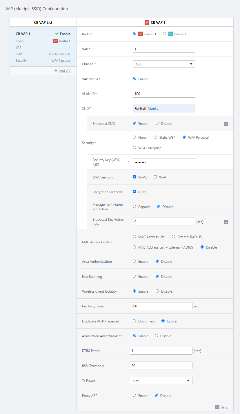SSID ForStaff-Mobile Specify an SSID (network name) to use on the CB VAP. Broadcast SSID Enable Specify whether to broadcast the SSID on the CB VAP. Security WPA Personal Specify a security method for the VAP. Security Key (WPA-PSK) 5+@f/=0N1y Specify an encryption key for the VAP. WPA Versions WPA2 Specify a WPA version to use on the VAP. Encryption Protocol CCMP Specify an encryption protocol to use on the VAP. Management Frame Protection Disable Specify whether to protect management frames from eavesdropping and forging. Broadcast Key Refresh Rate 0 Specify an interval at which to refresh the broadcast key that is sent to clients on the VAP. Specifying "0" stops the key from refreshing. MAC Access Control Disable Specify whether to use MAC Access Control on the VAP. Area Authentication Disable Specify whether to use the Area Authentication function. Fast Roaming Disable Specify whether to use Fast Roaming of wireless clients. Wireless Client Isolation