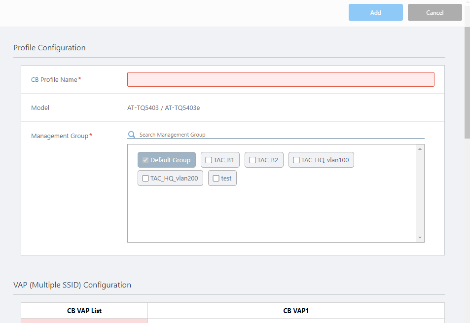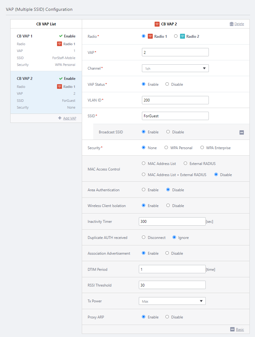- Next, click "+ Add VAP" on "VAP (Multiple SSID) Configuration" to create another CB VAP for guests.