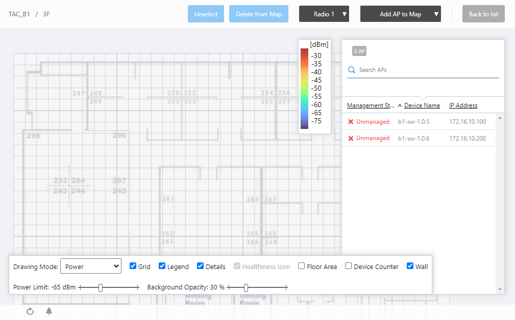 The "Add AP to Map" view will appear. A list of APs in the same management group as the map are shown on the right side of the screen.