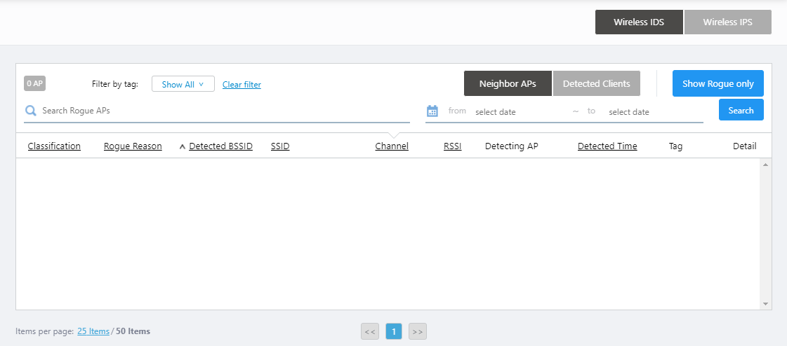 This page lists the APs and clients detected by the managed APs in the last 5 minutes. It also shows whether each AP or client is a rogue. A history of IPS action (attacks against rogue APs) can also be viewed.Refer to Supported Functions per AP Model > Wireless Monitoring > IDS/IPS Report for APs that support this function.