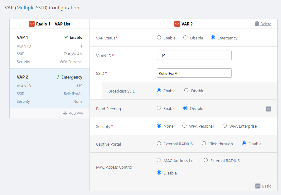 First you have to create a VAP which is dedicated for use when Emergency Mode is enabled.By preparing an emergency VAP in advance, you can quickly open it to the public in case of an emergency.