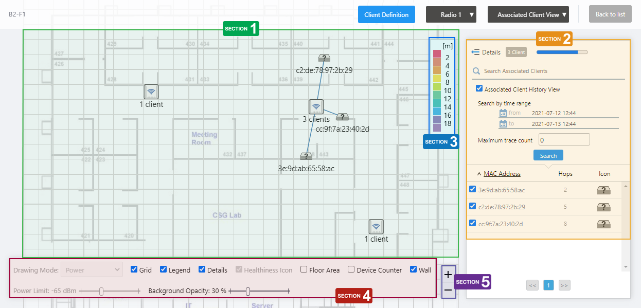 In the floor map details, you can monitor the status of APs, the number of associated clients, their locations and flow lines (when AWC-CB is used and the Client Location Estimation History function is enabled), and the connections of APs in the AWC-SC configuration, as well as monitor rogue APs detected by each managed AP.