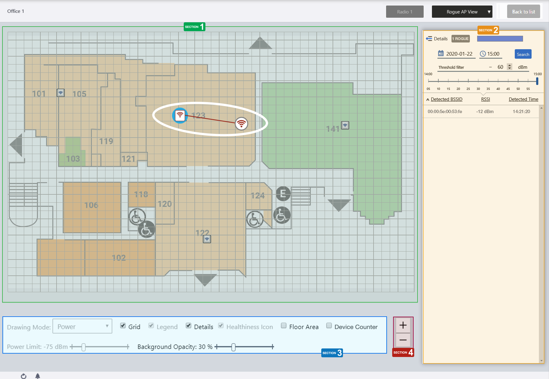 | Detected BSSID | Shows a list of BSSIDs that managed APs on the map detected. |