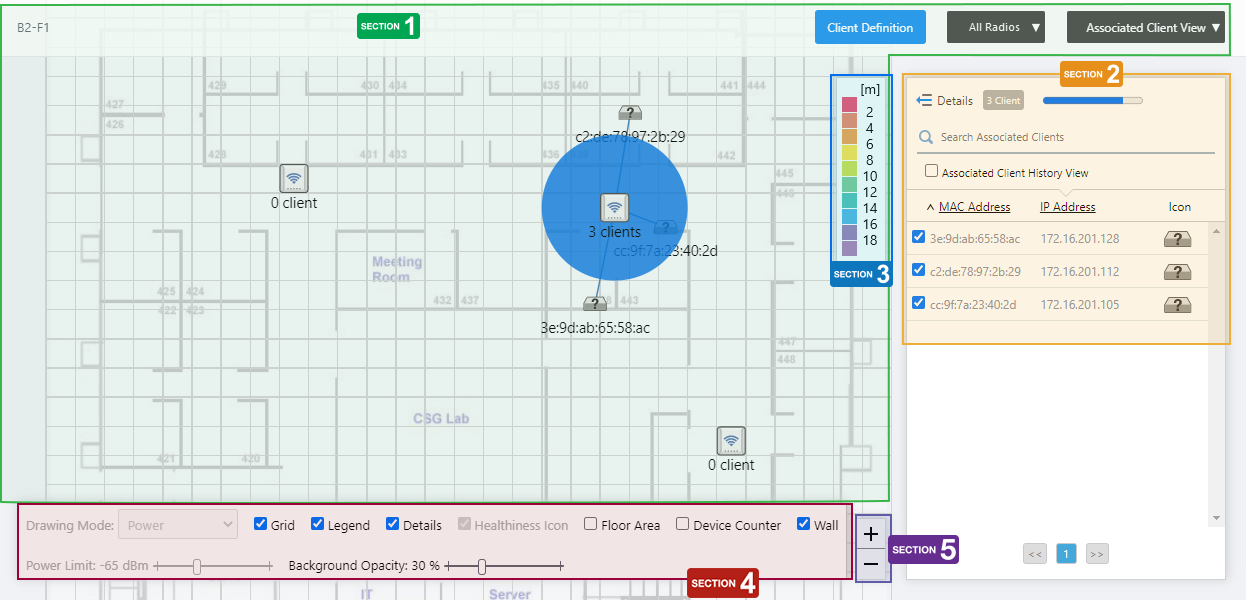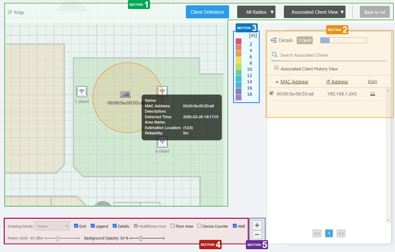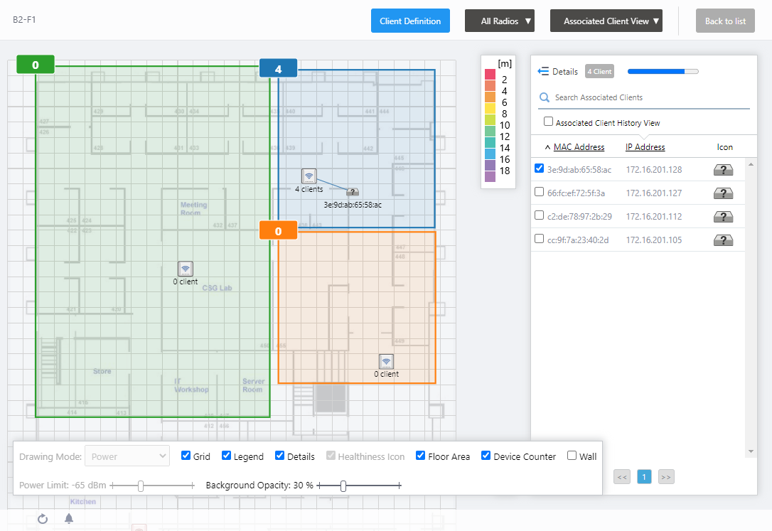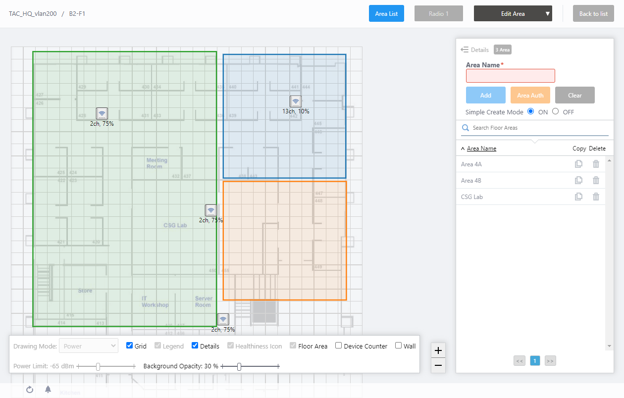 You can draw areas (rooms, etc.) with planar polygons, and name these areas such as "Meeting Room", "Lounge", and "Auditorium" on the floor map.The defined areas will be displayed in each View of the floor map, and also shown in the Location Estimation popup information in the Associated Client View.