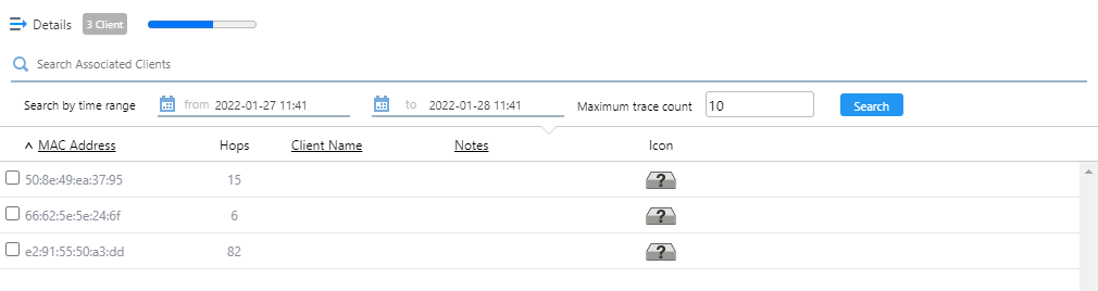 Filter entries in the list by entering a partial string in the search box. Displays the items among the current display targets that contain the string entered in this field in either " Device Name" or "Floor Map Name". To remove the filter, delete the string from the Search field and press Enter. NoteThe search is case-sensitive. |